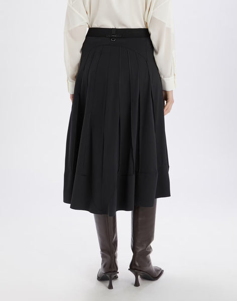 The Subtle skirt enhances the silhouette with its distinctive construction: exposed seams radiate from the waistline both front and back, opening into soft, flowing pleats that add graceful movement. Elasticated waistband. Slanted side pockets. Exposed seams. Midi length. Asymmetric hem.