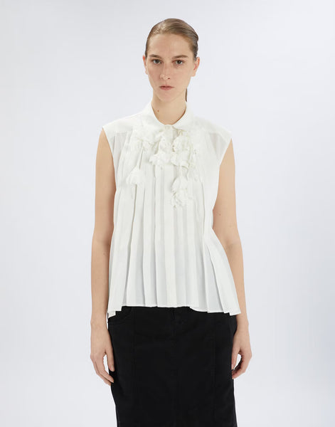 This sleeveless shirt features a lightly crinkled texture and stitched front pleats, creating a soft, modern look. A cascading tone-on-tone floral appliqué, crafted from the same raw-edge fabric, adds a sophisticated finish. Turn-down collar. Concealed front button closure. Sleeveless. Removable floral appliqué. Irregular pleats. Rounded back hem. Hip length.
