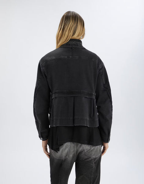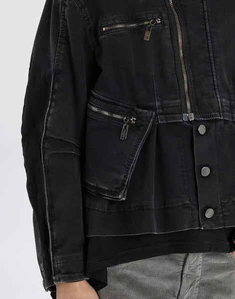 The Keira jacket channels an urban attitude with its boxy cut, bold zip details and marbled black finish. Made from slightly stretch denim and fully lined, it offers a modern reinterpretation of the classic denim jacket. Stand collar. Upper zip closure and metal buttons at the lower front. Chest zip pocket. Bellows pockets with zips, free at the bottom. Outward-facing stitched pleats on the sleeves. Metal buttoned cuffs. Exposed seams.